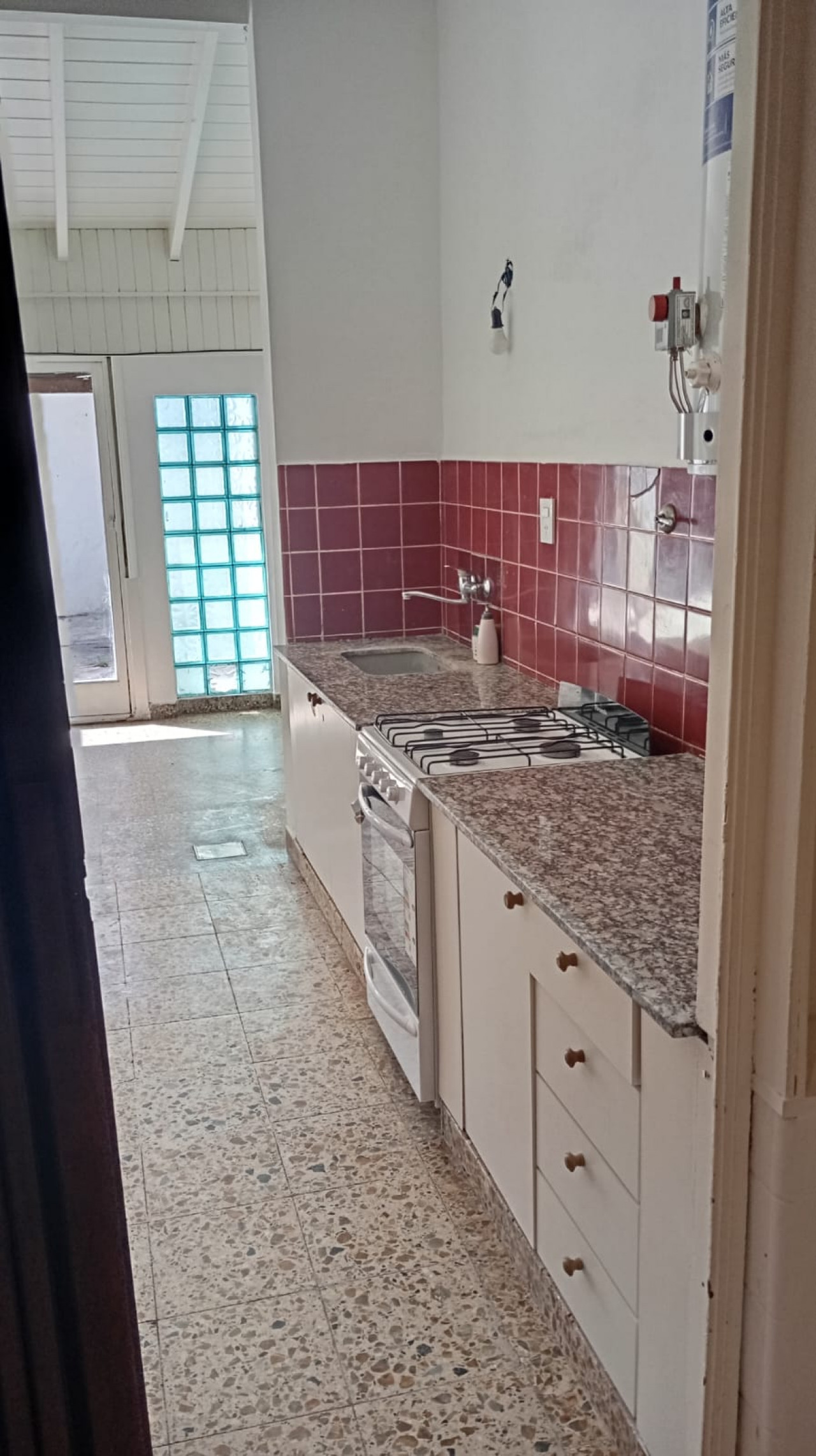 Cocina comedor diario con muebles bajo mesada, alacena y conexión para lavarropas, muy luminosa.